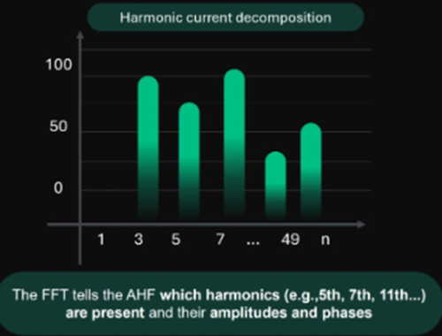 - Real time FFT harmonic detection is appliedto break down the complex current waveform into its frequency components: